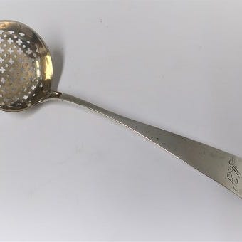 Antik strøske og flødenæb, 3 tårnet sølv, skaft i dobbelt rifler mønster. fra 1860. Strøske L 19 cm Vægt 33 gr. Flødenæb L. 15 cm Vægt 24 gr. sælges samlet