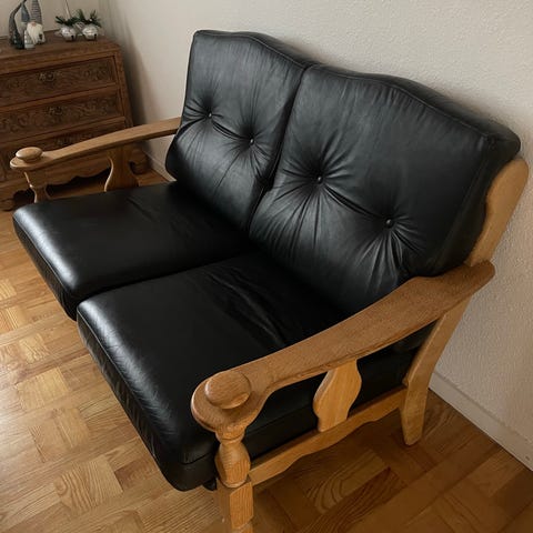 Sofa med stel af egetræ. Der er slidtage på stoffet – særligt det, der vender nedad. Billeder kan sendes ved interesse.