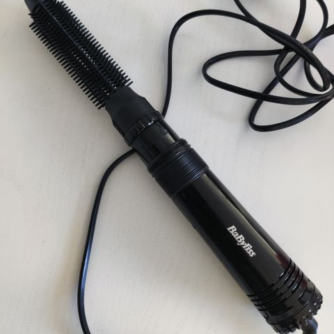 BaByliss krøllejern/varmluftsbørste: Til venstre ses et lilla BaByliss-apparat, der ligner et krøllejern eller en varmluftsbørste, kontant (Samlet)