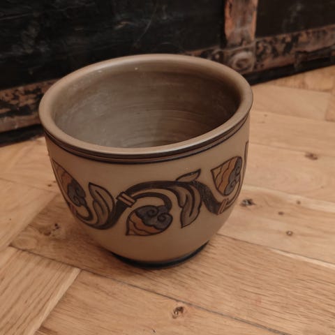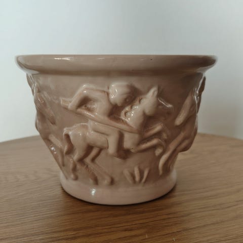 Flot og velholdt urtepotte fra L. Hjorth keramik Bornholm. Model 754. Med motiv af sværdkæmpere til hest.