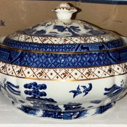 Spisestel i Real Old Willow fra Booths England 11 spisetallerkener og 12 dybe tallerkener og kartoffel skål og sovse skål, alle dele er uden skår
