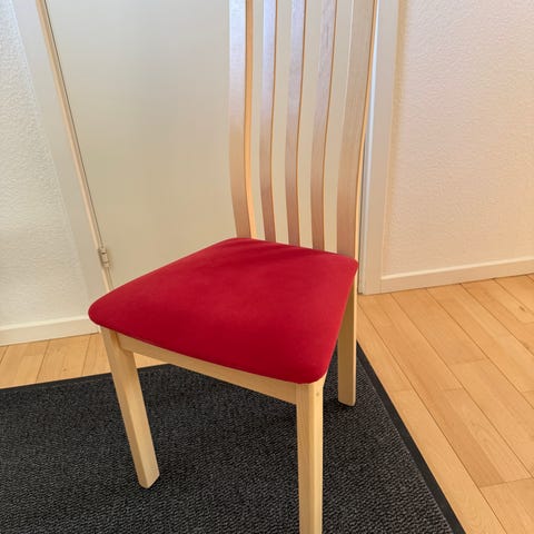 Spisestuestol/køkkenstol i lakeret bøg med stof sæder. Dansk produceret stol fra Findahls Møbelfabrik. Fra ikke ryger og dyrefrit hjem. 400 kr. Pr. Stk. Eller 6 stk. For 1.800 kr. (Netpris Ca. 1.849 kr. Pr. Stk.)