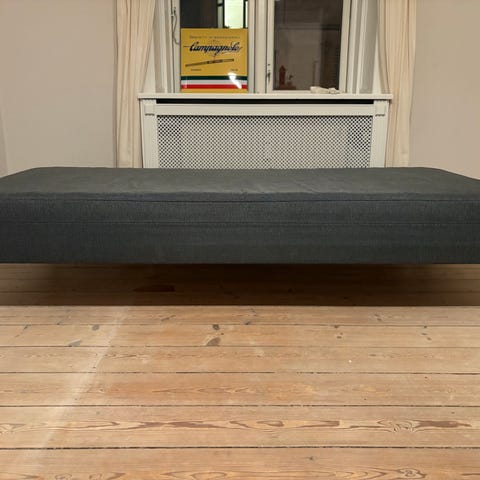 Jysk box madras i sort stof. Enkel og funktionel design. Hård madras. Den ene label er knækket men kan nemt repareres hvis ønsket. Nypris 1100.