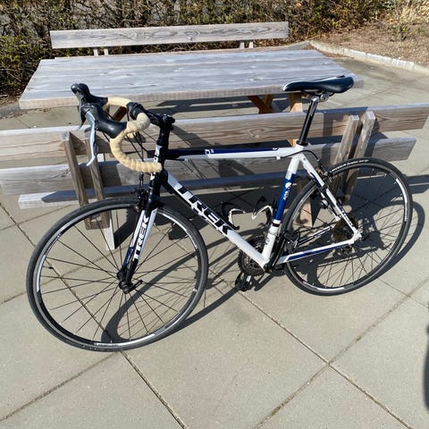 Trek Racer herrecykel i blå og sort farve. Cyklen er designet til racerkørsel med letvægtsramme og drop-styr for aerodynamisk position. Velegnet til landevejscykling og træning.der sætter simano 105 over alt kanon racercykel .Nedsat