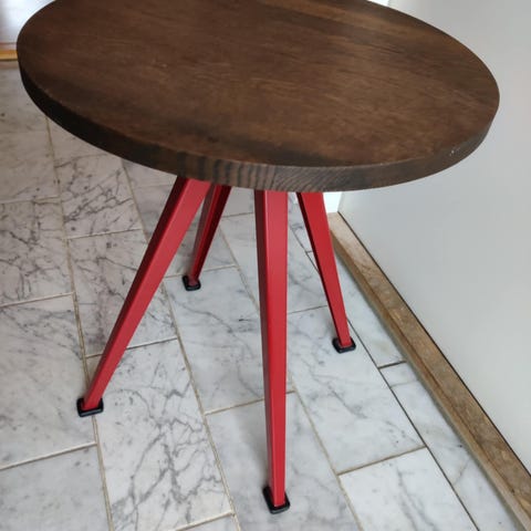 Bordpladen er udført i massiv eg, der giver et varmt og naturligt udtryk, mens stellet i pulverlakeret stål tilfører stabilitet og et moderne præg. Med sin kompakte størrelse og runde form er bordet ideelt som cafébord, mødebord eller som et fleksibelt bord i kantine- og loungeområder.