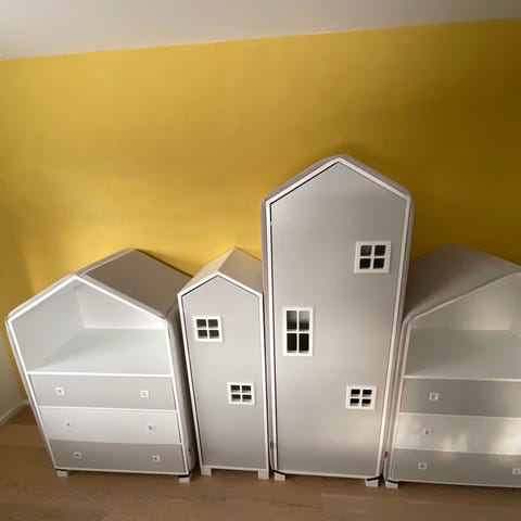Pænt og yderst velholdt møbelsæt af yderst højkvalitet til børneværelset. Det hele passer sammen i farve og stil og alle dele har god plads til opbevaring af tøj, legetøj, bøger mm. og er super anvendelige.