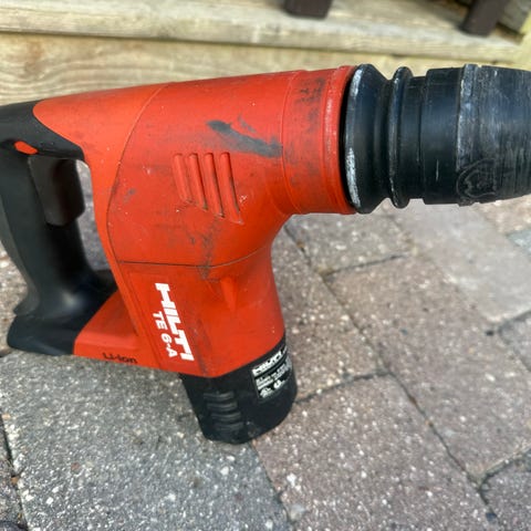 En kraftfuld Hilti TE 6-A36 borehammer. Maskinen er brugt, men fungerer som den skal, og er klar til mange timers arbejde. Der er lidt kosmetiske brugsspor, bl.a. ridser og et mindre snit i gummigrebet, men det påvirker ikke funktionaliteten på nogen måde, den kører bare derudaf.