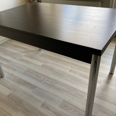 Meget flot spisebord i sort træ/finér og udtræk så det er praktisk til folk på besøg eller familien, der vokser. Spisebordet er også nem at vedligeholde. Billederne er lånt fra nettet da vi ikke bruge spisebordet nu. Jeg sender gerne flere billeder ved interesse!