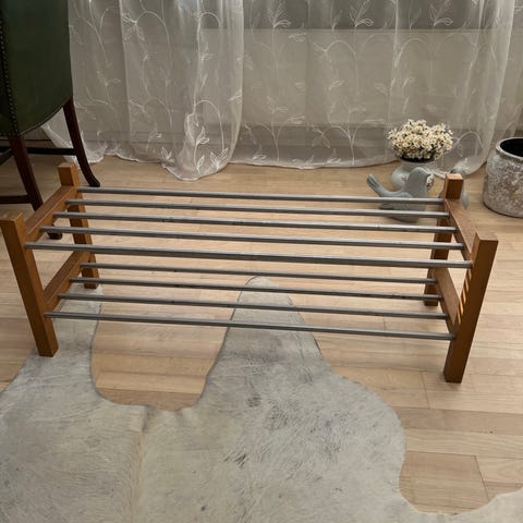 Sort træ og metal til ca 6 par sko på hylder + 3 par på gulv nederst. Jeg har brugt den som reol med planter øverst...