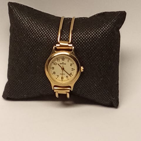BRIXON dameur med firkantet urskive og guldfarvet stållænke. Uret har en treleddet kædearmbånd i metal og en klar urskive med BRIXON-logo. Bagkassen er i rustfrit stål med modelnummer 1089. Designet til kvinder.