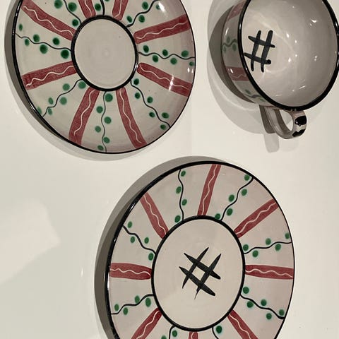 Blå med hvide striber. Hvid inderside i kopperne.