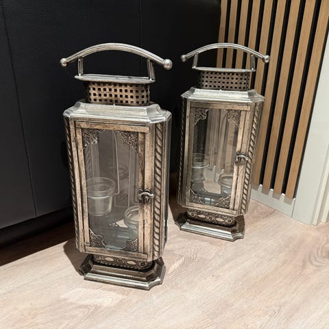 Bilderne bestående af rustikke lanterner i to størrelser med glas og metalramme i rustfarvet finish. To metallysestager med cirkulær skål og tre ben, grøn patina finish. Dekorativ skål med naturlige materialer som kogler og tørrede bær. Glaslysestager med motiver af hjorte og snefnug, grøn og hvid farve. To grønne metal lanterner i forskellig størrelse med glasindsats og ophængsbeslag.