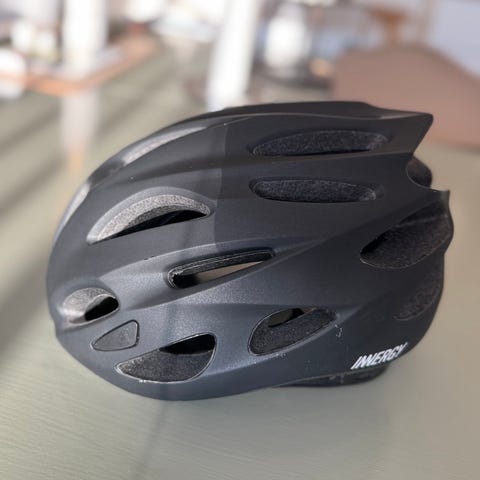 INERGY cykelhjelm i beige farve med flere ventilationshuller. Hjelmen har justerbar strop og polstret inderside for komfort og sikkerhed. Velegnet til cykling og andre aktiviteter, hvor hovedbeskyttelse er nødvendig.