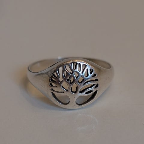 Sølvring Livets Træ. Vægt ca 7 gram . Belagt med platin. Helt nye. Faktura kan udskrives og kommer i smykkeæske. Har flere størrelser. 53/54/56/57/58/59.