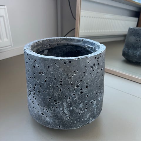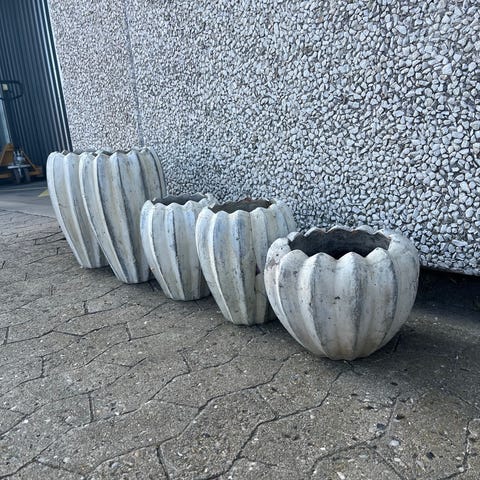 Sæt bestående af tre grå blomsterpotter i betonmateriale, velegnet til udendørs brug. Potterne har en rund form og varierer i størrelse, som vist på billederne. Sælges samlet