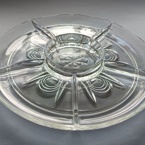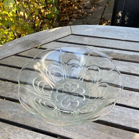 Yndigt skålsæt med assietter i presset glas fra Fyens Glasværk. Skåle med svejfet rand. Spørg, hvis du ønsker skåle med rundet rand og isfad.