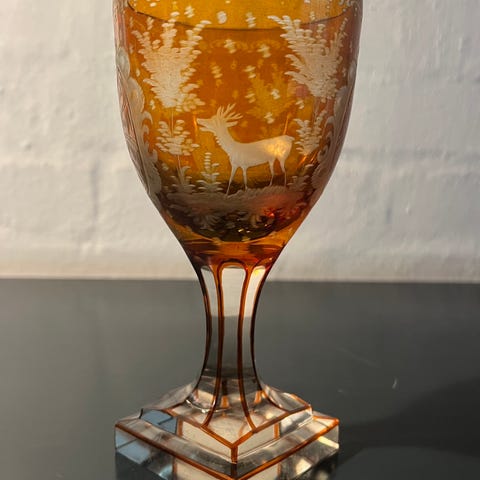 Smukt tysk glas af hessisk type slebet med løve samt teksten “Zorn vor Augen“. Højde: ca. 15 cm.