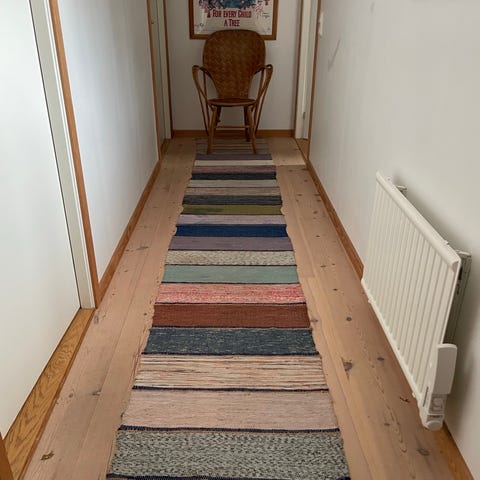 Fint, svensk, hjemmevævet trasmatta, som er vævet på en gård i Småland. Tæppet er med smukke blå farver.