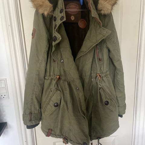 Let som en fjer Nypris 2500kr Kraven er af mongolian sheep hair Jakken er meget varm og i bedste kvalitet derfor vejer den ikke særlig meget og er meget behagelig at have på. Bemærk der står str M i nakken men den svarer til en str small, derfor er den sat til small i annoncen. Brystmål:102 cm Længde: 60cm Mærke: Nickelson