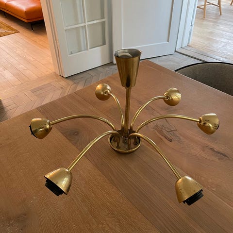 Nogle af fatningerne har fået et gulligt skær, men lampen fungerer fint og giver et flot, klassisk udtryk.