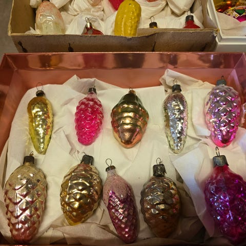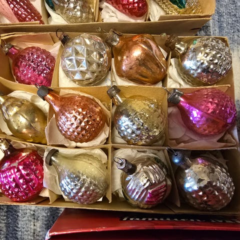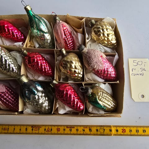 Juletræ kugler / julepynt af mundblæst og farvet glas, fra det tidligere Sovjetunionen / USSR / Ukraine. For størrelse, se fotos. I pæn stand uden skår, dog med forventelig patinering da de har en del år på bagen.