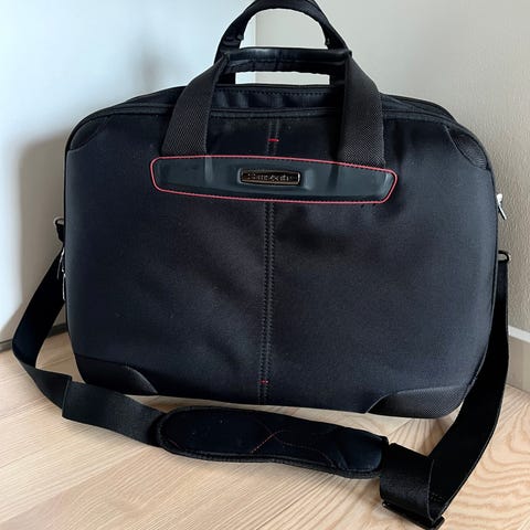 Samsonite laptop taske i sort stof designet til unisex brug. Tasken har håndtag til nem bæring og flere rum til opbevaring af bærbar computer og tilbehør. Materialet er holdbart og velegnet til daglig brug.