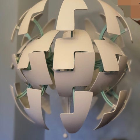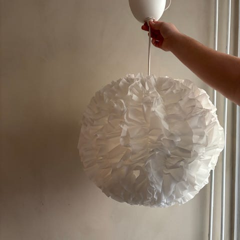 Loftslampe i hvid og grøn som kan åbnes for mere lys og lukkes helt for mindre lys.