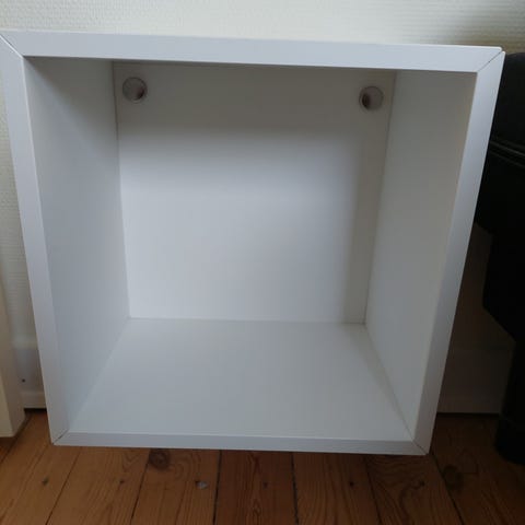 Koksgrå kube reol bogkasse fra ikea. Med ophæng. Fin stand, men en ridse øverst inden i. Så det først da jeg havde pillet det ned.