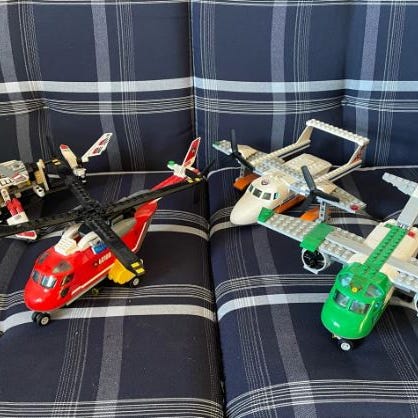 LEGO Andet miniature køretøjer i forskellige farver og designs. Sættet indeholder små byggede modeller af biler, lastbiler, fly og andre transportmidler i forskellige størrelser. Materialet er plastik, og produkterne er egnet til samling eller leg.