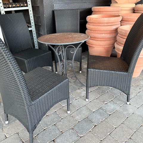 Havemøbelsæt bestående af 2 stole og et bord i sort fletmateriale. Møblerne er designet til udendørs brug og passer til mindre terrasser eller altaner. Stolene har armlæn og et ergonomisk design, mens bordet har en firkantet form med en glasplade på toppen.