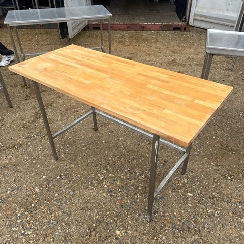 Træbord med to hylder i birketræ fra Ikea. Bordet har et simpelt design med en bordplade og to hylder under til opbevaring. Velegnet til brug i køkken, butik eller lignende miljø.