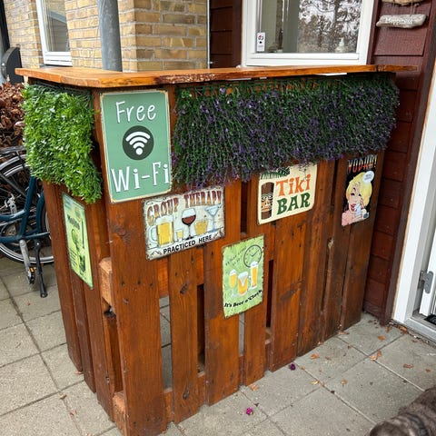 • Mindre tiki-bar i cirka målene 120 lang, 45cm dyb, 110 cm høj.