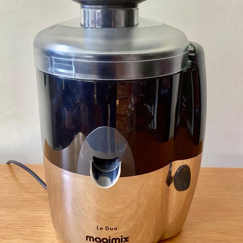 Magimix Le Duo juicepresser i rustfrit stål med sort top. Juicepresseren har en rund åbning til frugt og grøntsager og en udløbsmund i rustfrit stål til saft. Produktet er designet til husholdningsbrug og har en elektrisk tænd/sluk-knap på siden. Indvendigt ses en plastindsats med en roterende knivmekanisme til at presse juice. Der er synlige brugsspor og mindre misfarvning indvendigt. Kun en skive