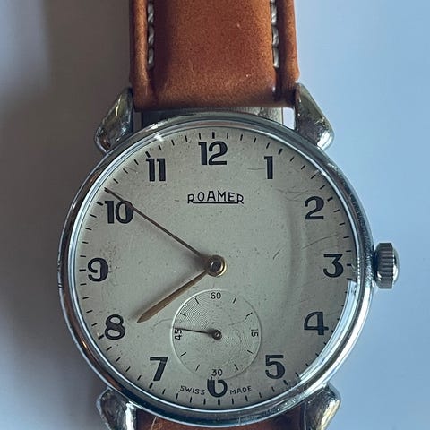 Flot vintage Roamer Brevete med subseconds og en flot patineret skive. Mekanisk værk med manuelt optræk. 35 mm uden krone