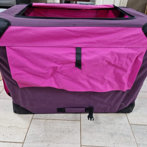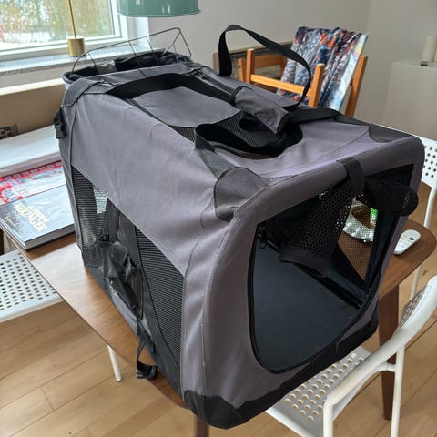 Transportabel hundebur lavet af gråt stof med netvinduer for ventilation.