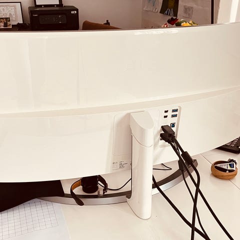 Acer Curved Skærm med en skærmstørrelse på 34 tommer og 120 hz. Skærmen har en buet form og er sort med røde detaljer bagpå. Den har flere tilslutningsmuligheder, som vist på billederne. Skærmen er designet til brug ved computerarbejde og underholdning.