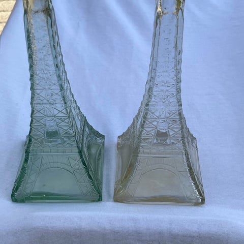 Super dekorativ glas Eiffeltårn fra Paris. Pæn stor vintage souvenir- oprindeligt beholder til vin o.l. Med prop samt en lille nøglering i messing. Vil eventuelt kunne bruges som vase. I fin stand.