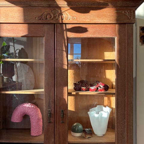 Eg / egetræ / egetræslook hænge vitrine med glas og lys. Laminat ikke massivt. Kan leveres mod betaling.