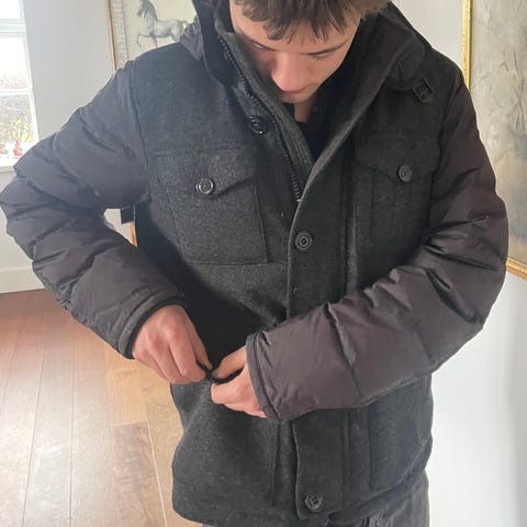 Frakken er meget varm og vindtæt med gåsedun og indvendig lynlås foran