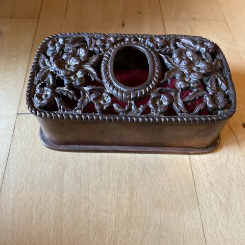 Gammelt metalsmykkeskrin beklædt med førdbrunt læderagtig materiale
