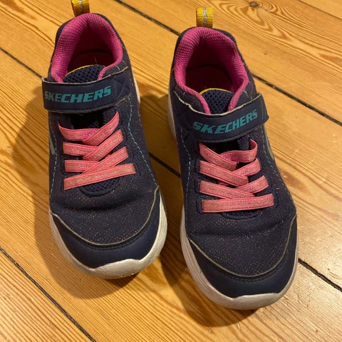 Skechers pige sneakers i størrelse 25. Skoene er lyserøde med hjerteformede detaljer på siden. De har velcrolukning og snørebånd for justerbar pasform. Materialet er tekstil og syntetisk. Velegnet til børn.