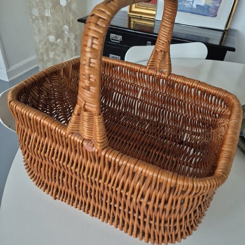 Fin stor kurv med hank. 53 cm lang, 43 cm bred. Kan bruges til alt fra strikketøj til picnickurv og kan rumme meget. Sender ikke.