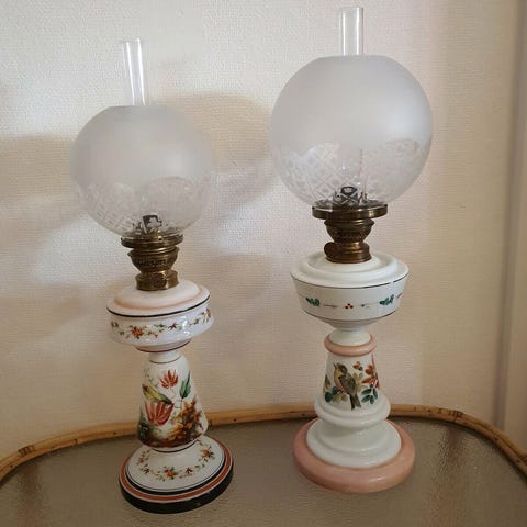 2 antikke messing-petroleums lamper med hvide opal-glas skærme.