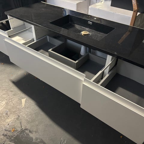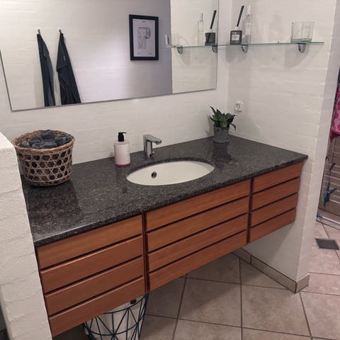 1 stk. Skab med skuffe og hylder og topplade i granit megen til vasken.