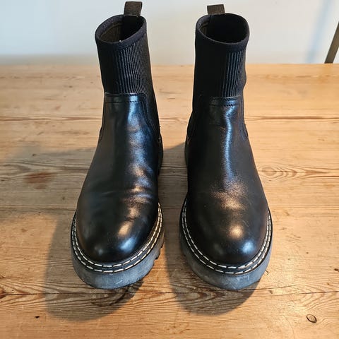 Støvlerne er lavet i læder med gummi tå og stødabsorberende såler. De har elastikbånd i hver side, så de er super nemme af få på, og sidder behageligt på foden. Rigtig fin støvle.