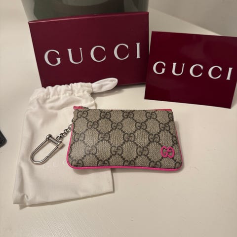 Gucci GG Supreme pung i læder med det beige GG logo stof samt flot hindbærrød farve.
