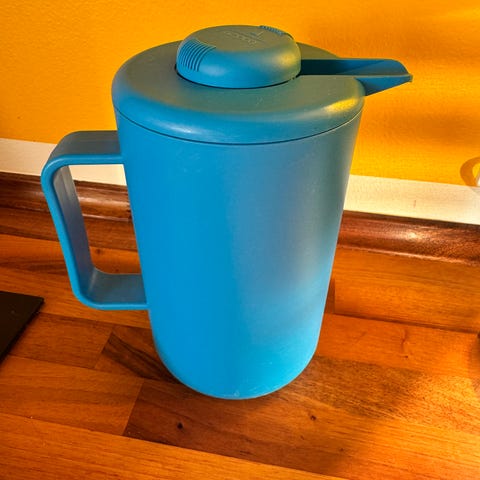 Bodum termokande med håndtag, i rosa farve. Kanden har et låg med en indbygget pumpefunktion til nem dosering. Materialet ser ud til at være plast og metal, designet til at holde drikkevarer varme eller kolde. Velegnet til brug i køkkenet eller til servering.
