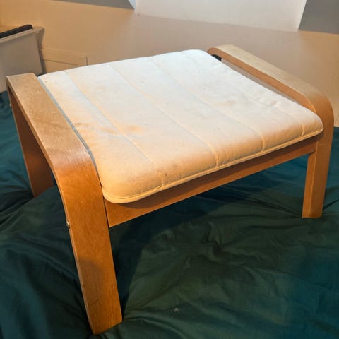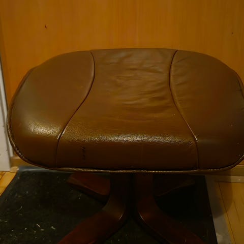 Læder fodskammel Poäng fra IKEA. Den har stel af bøg.