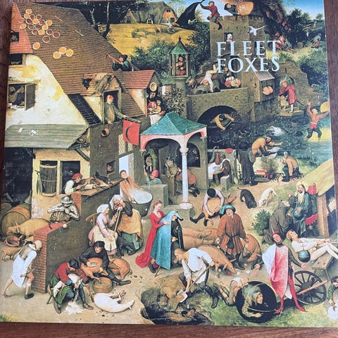 Fleet Foxes Selvbetegnende Album Musik CD 2-disk sæt indeholder to cd'er med albumets musik. Coveret viser et detaljeret kunstværk med en pastoral scene. Pakken inkluderer også et foldet indstik med tekst og illustrationer.