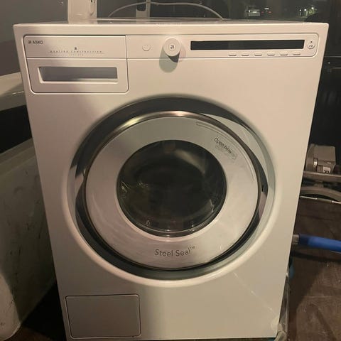 Asko Frontbetjent vaskemaskine i hvid farve. Maskinen har en frontbetjent åbning og er designet til effektiv vask af tøj. Specifikationer inkluderer modelnummer 20686AC_W12, med en strømforbrug på 2200 W og en spænding på 220-240 V. Maskinen er udstyret med en tromle til vask og rum til vaskemiddel og skyllemiddel. Velegnet til almindelig husholdningsvask.